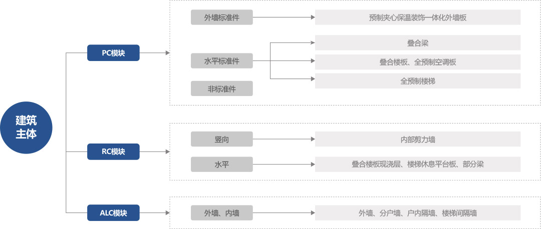 建筑主体可分为现浇??楹驮ぶ颇??,预制模块又可分为PC??楹虯LC??椤?/p>